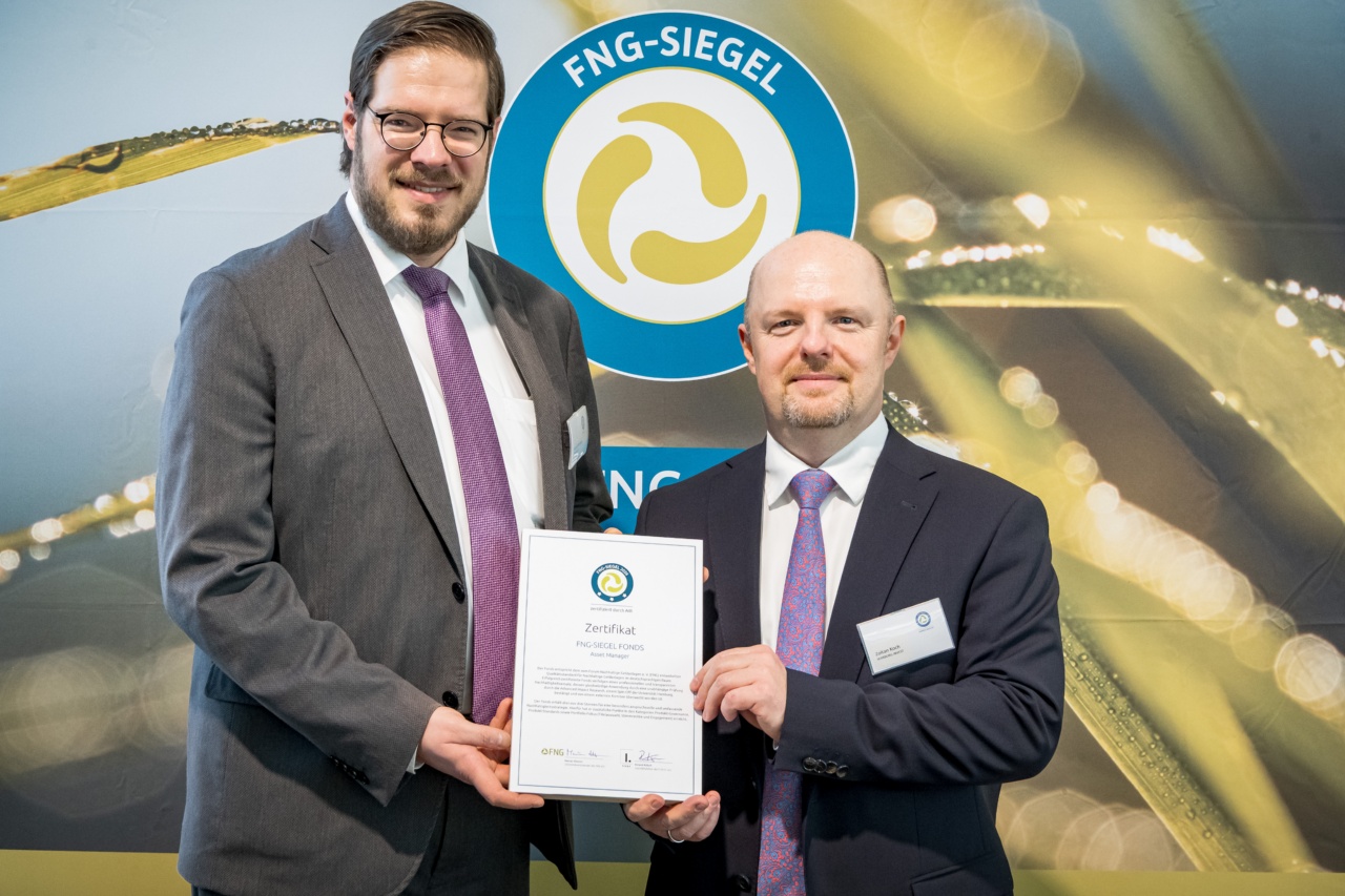 Im deutschsprachigen Raum ist das unabhängige FNG-Siegel das bekannteste Qualitätssiegel für nachhaltige Investmentfonds und als Auswahlhilfe für Anleger etabliert. Timm von Beuningen und Zoltan Koch nahmen die Auszeichnung vor Ort bei der Vergabefeier in Frankfurt entgegen. Herzlichen Glückwunsch!