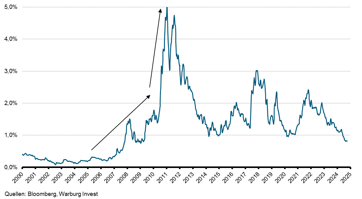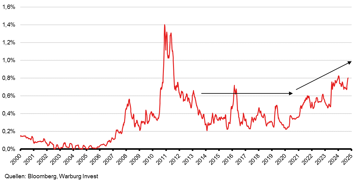 Wie sehr sich die wirtschaftliche und politische Gemengelage in Frankreich bereits zugespitzt hat, lässt sich auch an der Entwicklung des Rentenmarkts ablesen. Mit Blick auf den Renditeaufschlag von französischen Staatsanleihen mit 10-jähriger Laufzeit über vergleichbare deutsche Staatsanleihen – dem unangefochtenen Proxy für risikolose Anlagen in Europa – lässt sich seit 2021 eine graduelle Ausweitung feststellen. Diese Entwicklung hat sich mit der plötzlichen Ankündigung vorgezogener Neuwahlen im Mai 2024 nochmals deutlich beschleunigt. Der aktuelle Renditeaufschlag handelt auf einem Niveau wie im Jahr 2012. Damals hatte die Eurokrise gerade erst ihren Zenit überschritten.
