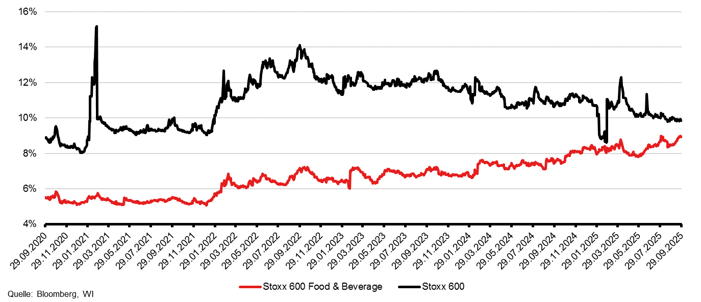 Deshalb stellt sich die Frage: Jetzt genauer hinschauen? Für Anleger, die sich vor potenziell stürmischeren Märkten („Wann platzt die KI‑Blase?“) schützen wollen, können defensivere Titel inzwischen attraktiv wirken. Niedrigere Zinsen machen Unternehmen mit stabilen Erträgen und soliden Dividenden wieder interessanter — vorausgesetzt, die positiven fundamentalen Trends setzen sich fort. In den vergangenen Jahren war das allerdings nicht der Fall: Wie die obere Grafik zeigt, sind die Gewinnerwartungen pro Aktie im Lebensmittel- und Getränkesektor kontinuierlich gesunken. In den letzten Wochen hat sich die Gewinnerwartung stabilisiert, vielleicht ist das schon das erste Zeichen einer Trendwende.