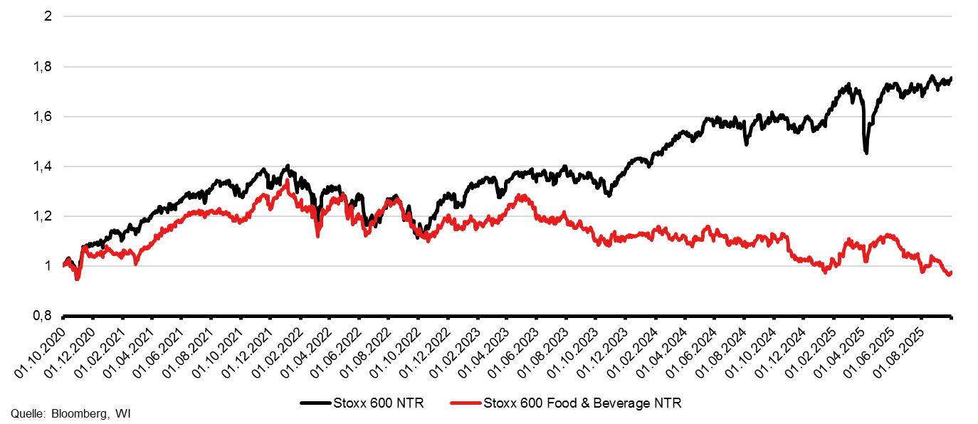 Besonders stark betroffen war der Lebensmittel‑ und Getränke‑Sektor. Zunächst belasteten hohe Inflation und Margendruck, anschließend führte der durch Abnehmmedikamente verursachte geringere Nachfrage (GLP‑1) zu weiteren Kursrückgängen.